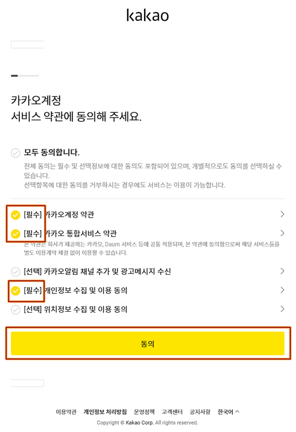 ▲ '필수' 항목만 체크해서 동의해서 넘어가고...