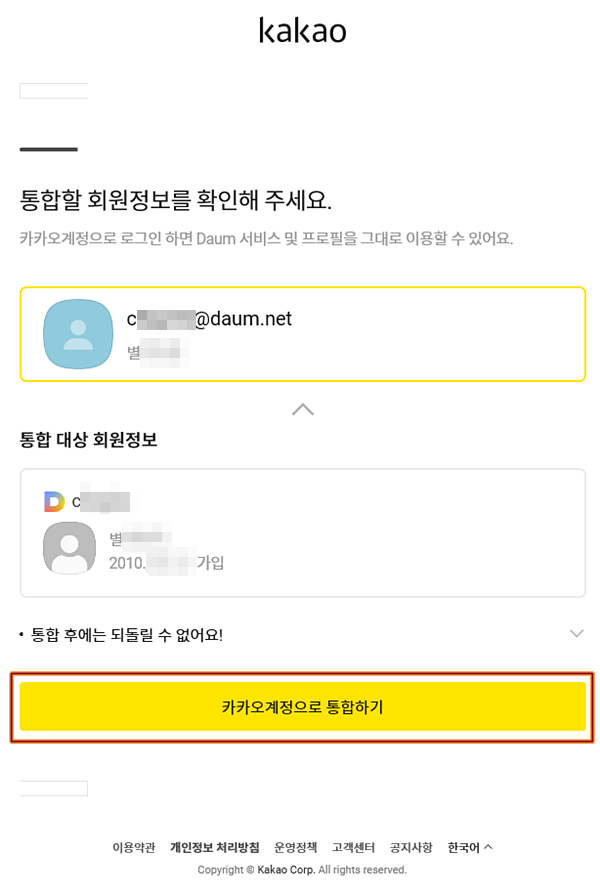 ▲ 카카오계정으로 통합하는 과정이 시작됩니다.