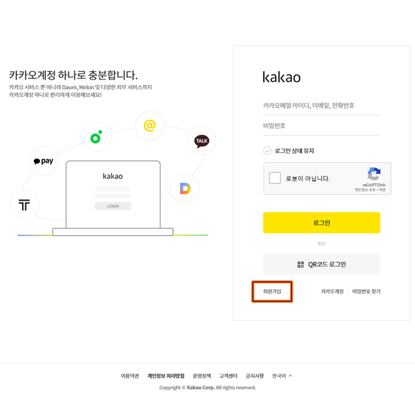▲ 저는 티스토리 때문에 카카오계정이 있었지만, 통합하려는 'daum 계정'을 '티스토리 카카오계정'과 연동해서 사용할것도 아니고 해서, 새로운 카카오계정이 필요했기 때문에 '회원가입' 을 눌렀습니다.