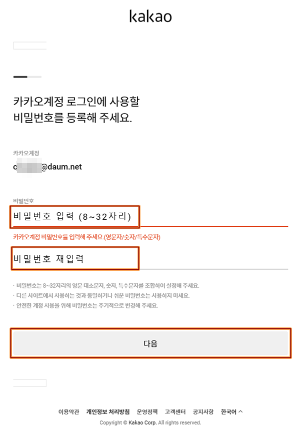 비밀번호를 넣는데, 새로운 카카오계정으로 쓸 비밀번호를 새로 만들어 써도 되고, 잊어먹지 않기 위해 기존 Daum 계정의 비밀번호로 사용해도 됩니다.