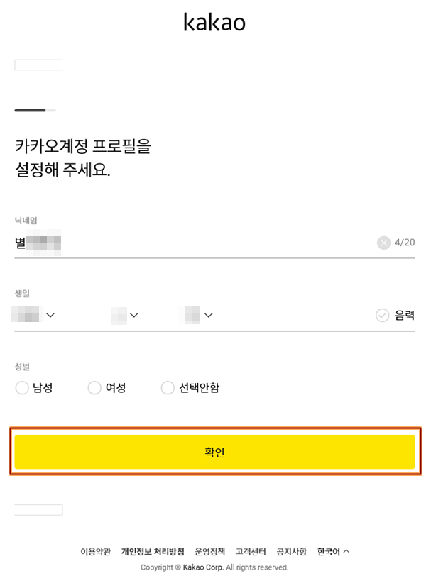▲ 기존 Daum 계정에서의 닉네임, 생년월일, 성별이 넘어옵니다. 수정사항 있으면 고친후, 확인하고 진행하면 되며...