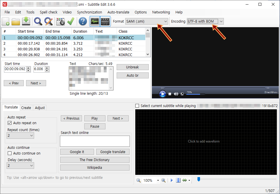 참고로 'Encoding' 을 어떤걸로 하는지에 따라 폰트가 깨져보이기도 하고 그랬는데, 제 경우에는 'UTF-8 with BOM' 으로 해야 폰트가 정상적으로 나왔습니다. 'Format'은 SAMI (.smi) 로 했었구요.