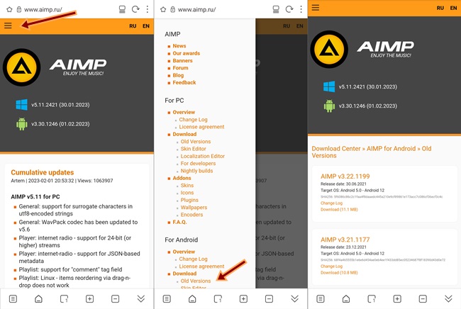 ▲ 메뉴 > For Android > Download > Old Version 으로 가서 "AIMP_3.10.1052.apk" 을 다운받아 설치했습니다.