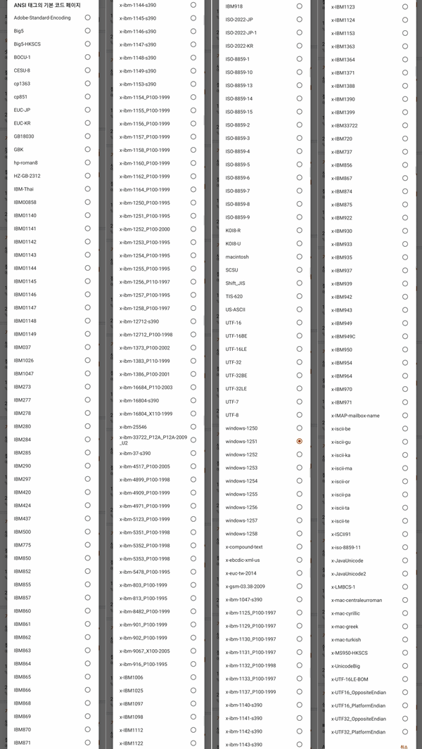 ▲ 인코딩 부분 확인해보니 디폴트로는 아무것도 안잡혀있었고, 들어가보면 20여개 정도의 리스트만 있었습니다.