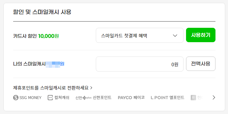 ▲ 올댓 경유시에는 '스마일캐시' 를 적용하는 칸이 없이, 전액을 신한카드로만 결제해야 했습니다.