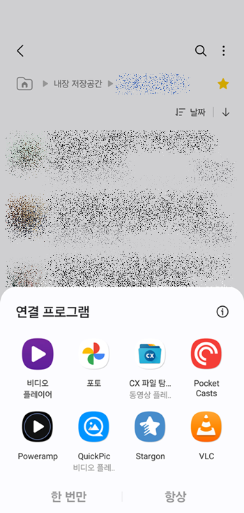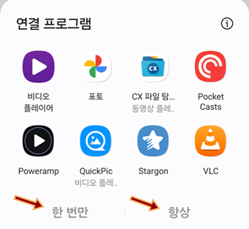 현재 폰에 설치되지 않은 동영상 플레이어 앱을 추가로 설치하면 다시 '한 번만 / 항상' 의 팝업이 뜹니다.