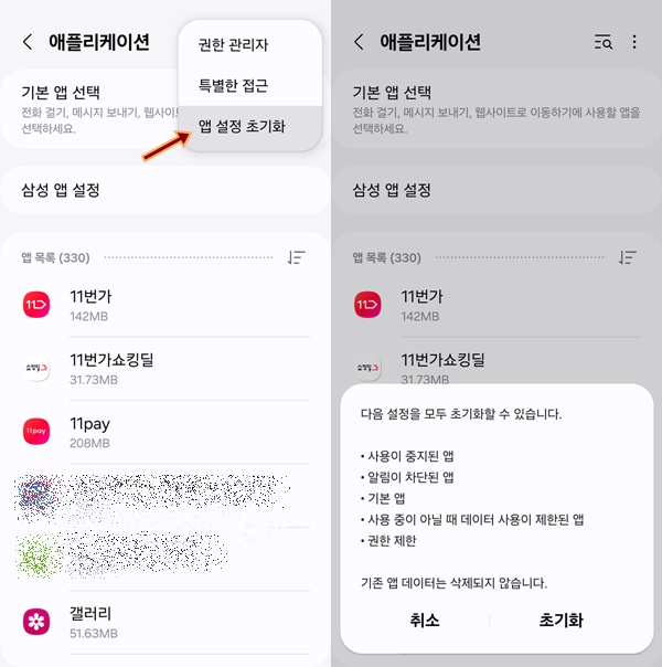 '앱 설정 초기화' 저거는 왠만해서 건드리지 마시기를 바랍니다.