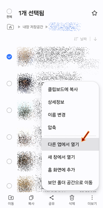 ▲ 그래서, 길게 터치를 하고, 우하단 '더보기'를 눌러서 '다른 앱에서 열기' 를 선택해서 'VLC'앱으로 열리게끔 변경하려고 했는데....